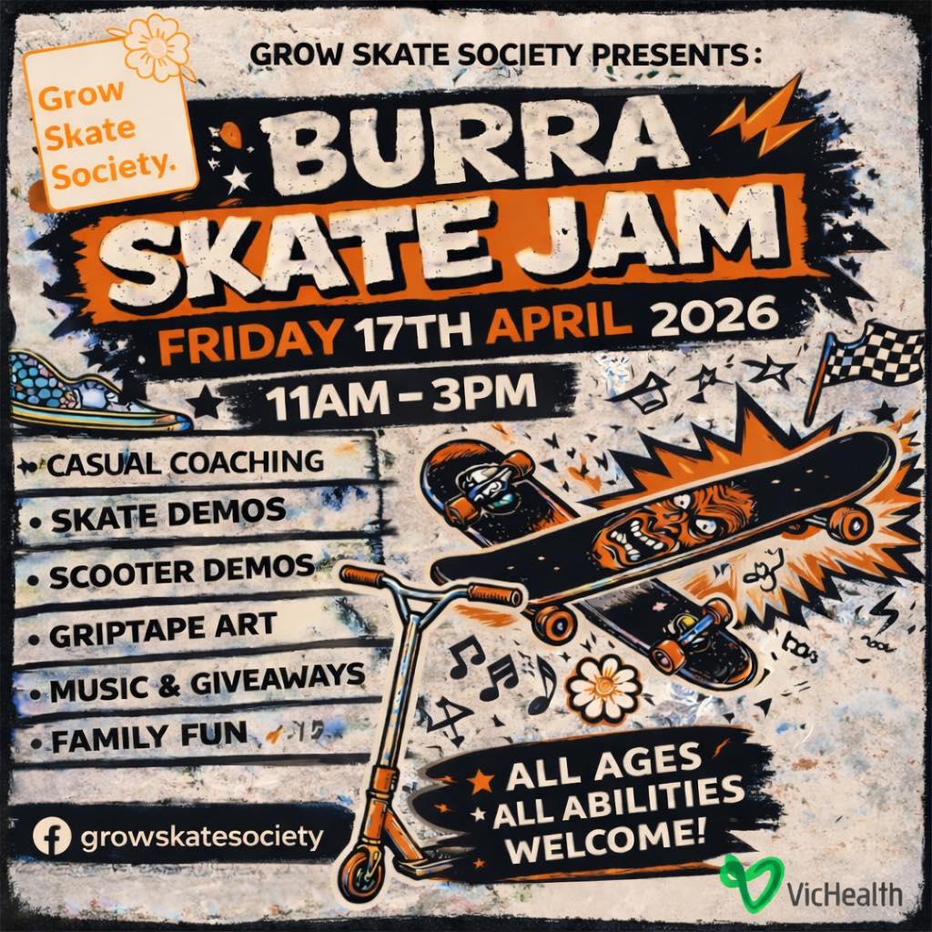 Get ready to shred! Grow Skate Society is bringing the heat to the New Korumburra Skate Park for a Community Skate Day Sponsored by VicHealth. Whether you’re rolling on four wheels or two, this is your day to own the park.
