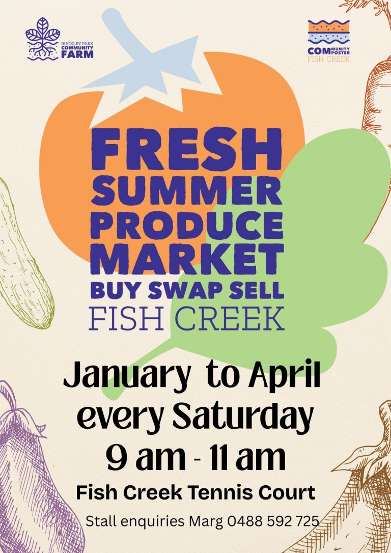 Hosted by Buckley Park Community Farm and Composter, Fish Creek Summer Produce Market 2026 runs from January to April every Saturday, 9 to 11am at Fish Creek Tennis Court.