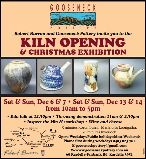 6 – 7 December and 13 – 14 December, 10am to 5pm. Pots from the latest firing, throwing demonstrations 11am & 2.30pm. Inspect the kiln & the workshop, kiln talk at 12.30, wine and cheese. Weekends through December and January.