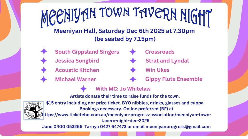 Our last Tavern Night of the year is coming up on Sat Dec 6th at Meeniyan Hall. Be seated by 7.15pm. Don’t miss 3-song performances from favourites Acoustic Kitchen, Jessica Songbird, Gippy Flute Ensemble, Strat and Lyndal, South Gippsland Singers, Win Ukes, Michael Warner and Crossroads.
