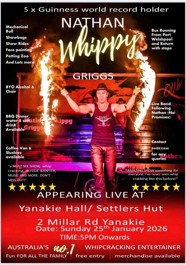 Nathan Whippy Griggs – 5 x Guiness World Record holder and Australia’s No.1 whip cracking entertainer appearing live at Yanakie Hall / Settler’s Hut, 2 Millar Road, Yanakie on Sunday 25th January. 5pm onwards.