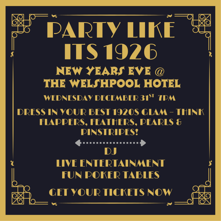 New Year’s Eve 2025, we’re going back in time – It’s Prohibition, and the party’s on! For one unforgettable night, we’re transforming The Welshpool Hotel into the ultimate 1920s speakeasy.
