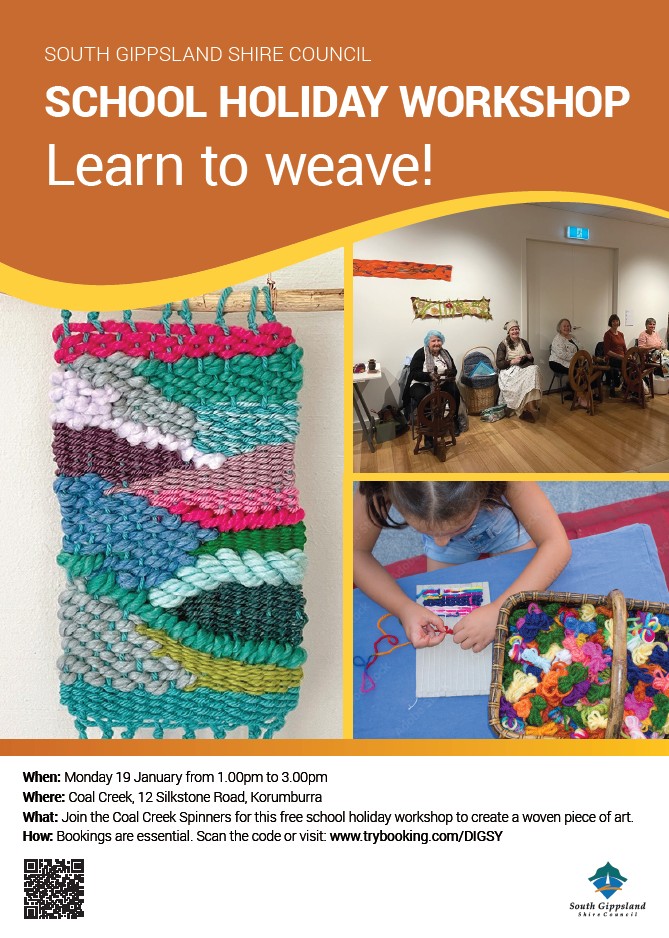 Join the Coal Creek Spinners for this free school holiday workshop to create a woven piece of art. Monday 19 January from 1.00pm to 3.00pm