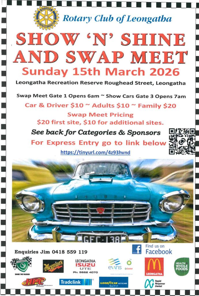 Swap Meet sites: $20 & $10 additional sites. Enquiries: Jim 0418 559 119 or RotaryLeongatha@gmail.com