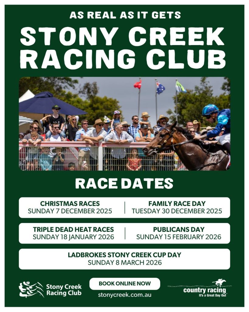 Stuck for school holiday ideas? Stony Creek Races on Sunday 18th of January is your answer to a day full of family-friendly entertainment! The kids will also be kept entertained all day with pony rides and Jockey-Cam VR experience. In between races the lawn will the place to be with live music.