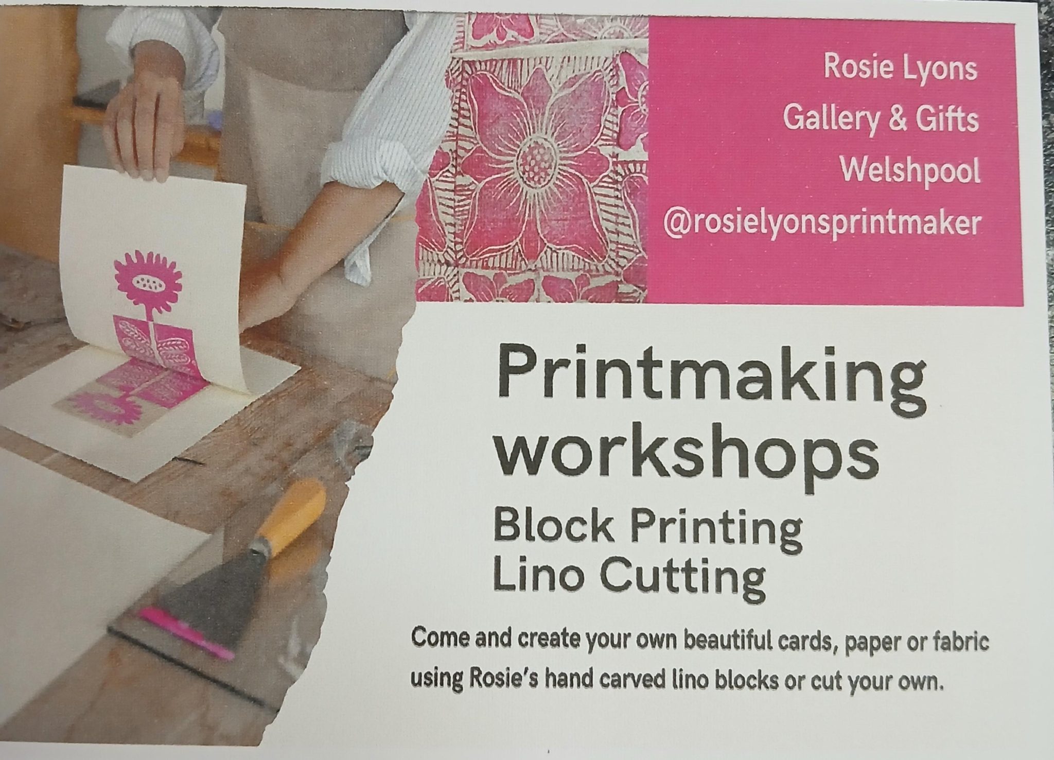 Block Printing & Lino Cutting. Come and create your own beautiful cards, paper or fabric, using Rosie’s Hand carved lino blocks or cut your own. Small, relaxed printmaking classes, all materials provided. No experience necessary, just bring your own creativity, perfect for beginners and makers. When: Saturday and Sundays, 11am to 1pm. Cost: $30 Adult / $25 per child.